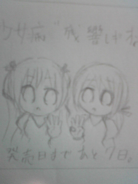 こんばんは。 愛羅です。 今日からCD発売までカウントダウンをします!! 一度してみたかったの。 見えにくいですが(愛羅の携帯のカメラは画像がよくないのです。。。) 少女病『儀典セクサリス』の『蒼を受け継ぎし者』より~ ライザの双子の妹ですvv また時間あるときにしっかり描きたいなぁ。。。 ミニ小話までは書けませんでした。。。